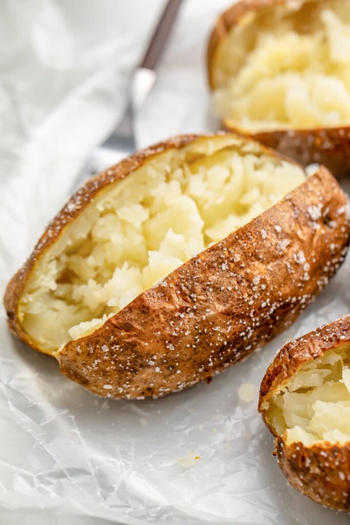 Select medium to large russet potatoes. They are high in starch and ideal for baking. Their thick skin crisps beautifully, and the flesh becomes light and fluffy. Avoid waxy potatoes like red or Yukon Gold if your goal is crispiness.