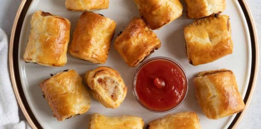 Easy air fryer sausage rolls with crisp puff pastry and delicious sausage meat and apple filling!