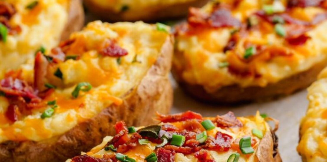 - Fill baked potatoes with potato mixture and place on a large baking sheet. Top with remaining ½ cup cheddar. Bake until cheese is melty and outside is crispy, about 15 minutes.