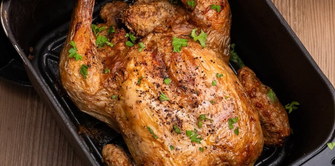 Next time you’re at the store, pick up a whole chicken, pull out your air fryer, and prepare for one of the juiciest, most flavorful birds you’ve ever cooked—no oven required.