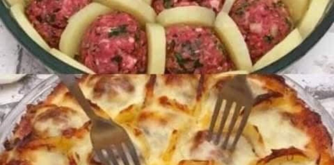 Cheesy Potato & Meatball Casserole – Juicy seasoned meatballs nestled between layers of potato slices, baked in a creamy sauce, and topped with golden, bubbly cheese. Comfort food at its best!
