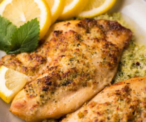 • Spray, with cooking spray, or brush your fish with olive oil, then dip your filets into the crust mixture, using your hands to press the crust into the fish.