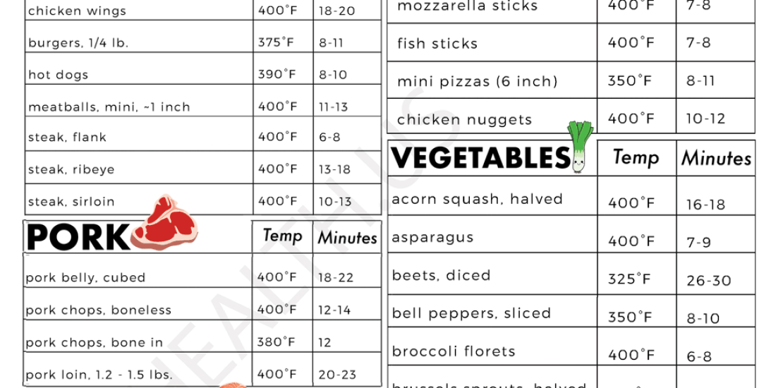 With these factors in mind, let’s dive into a detailed air fryer cook times chart that will help you achieve culinary perfection with your favorite dishes.